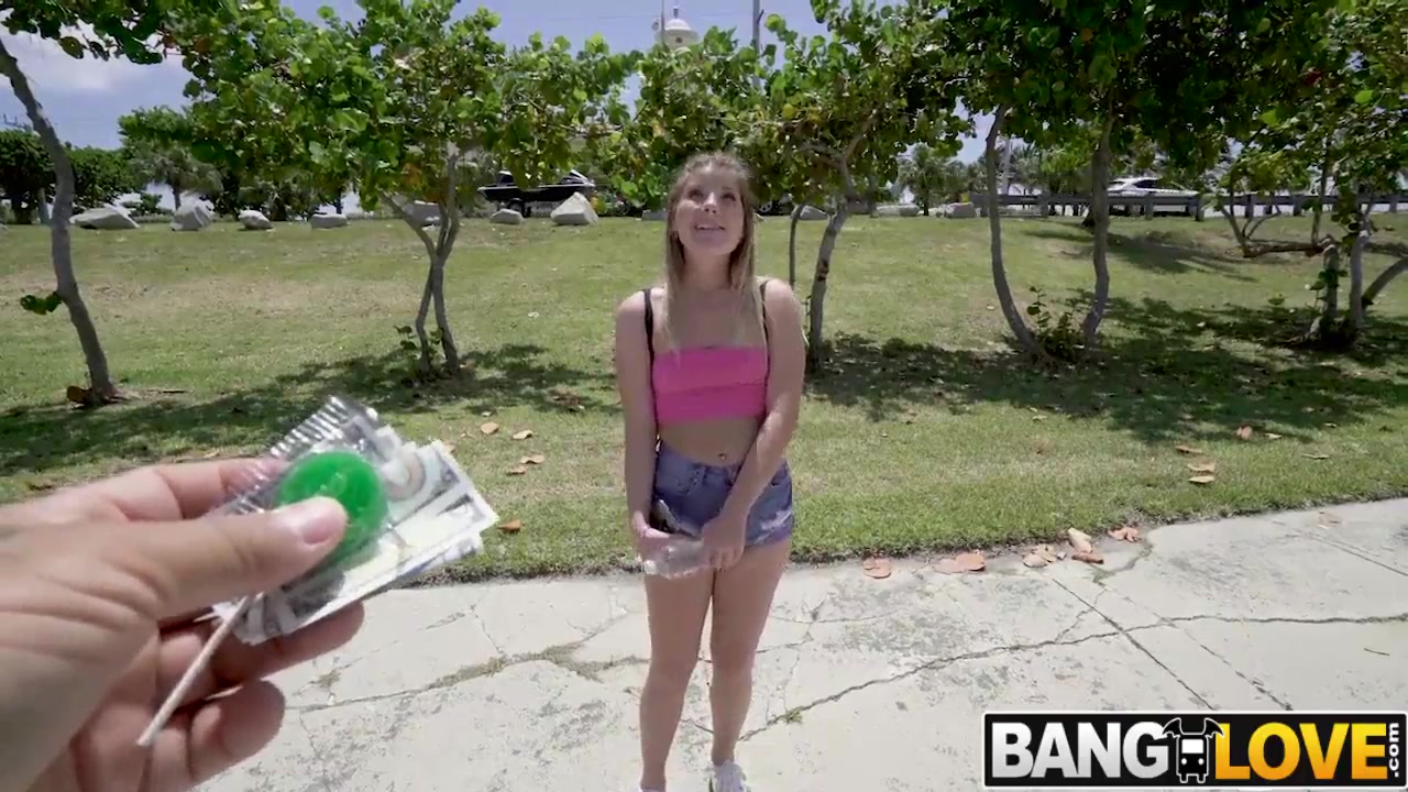 This week the bus pulled up on a some chick at the beach waiting for some friends. As it turns out, she ended up going to the wrong beach. Being from Oklahoma, she doesn’t really know her way around so we convinced her to hop on for a free ride. Inside the bus, we slowly got her to get naked by flashing her some money. Soon after, our boy Peter Green got to fuck her. He penetrated her pussy in several different positions before busting all over her face.