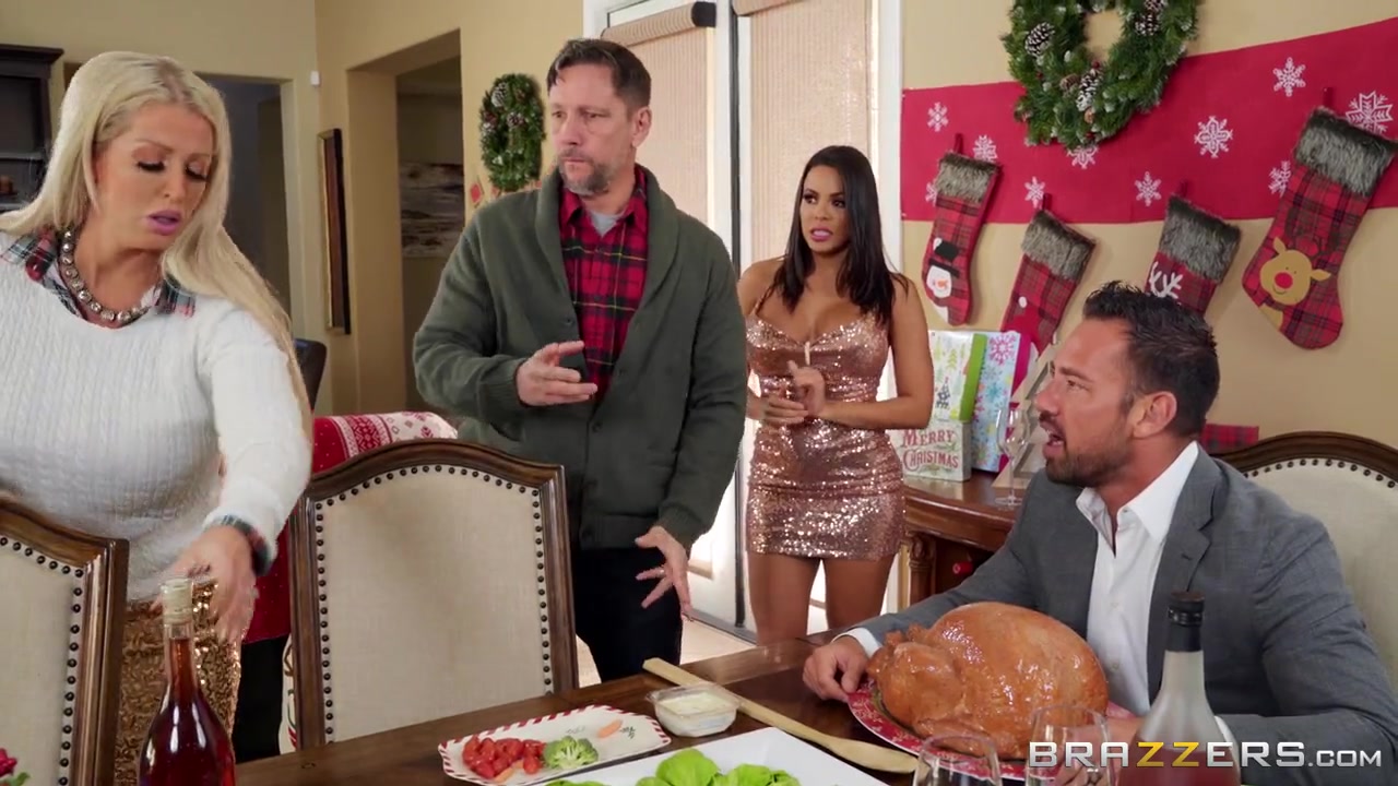 The final couple arrives for Christmas dinner and it’s Uncle Pete (who looks like he’s already sipped a few too many glasses of eggnog) and Luna Star, who is obviously an escort because she’s way out of his league! While Pete gets a verbal spanking from the matriarch of the family, her much younger husband, Johnny Castle, stares at the eye candy that is Luna Star. Luna looks like she wants to get frisky, and when temptation proves too hard to resist, Johnny escapes to his man cave for some TV. That doesn’t stop Luna from following him though, and when she tells him she’s expecting to fuck somebody tonight, she serves up her ass as a main dish too tasty for Johnny to turn down!