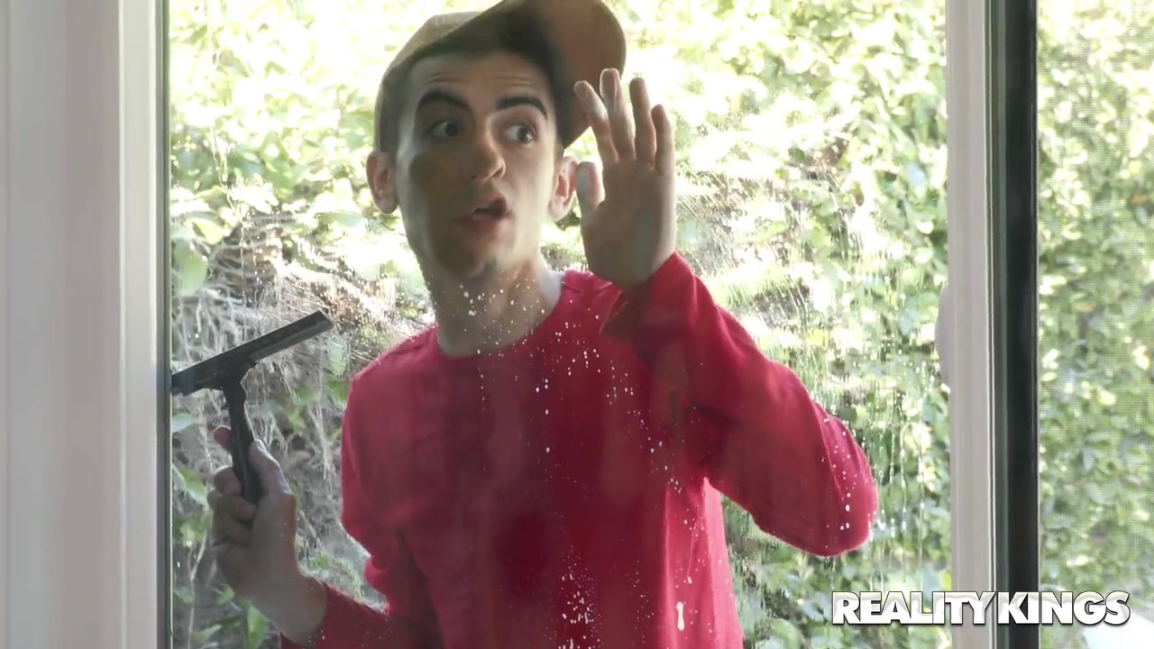 Jordi might be getting paid to wash Ryan Keely’s windows but he’d rather watch her! Ryan seems to be getting a kick out of the little peeper checking her out from outside, so she puts on a little show for Jordi, stripping out of her skirt and playing with her big tits in plain sight! While Ryan rubs her sweet pussy, peeping Jordi rubs his cock against the window and stares. When playing with herself isn’t enough, Ryan drags Jordi inside and for some hardcore fucking that’ll really give him something to remember!