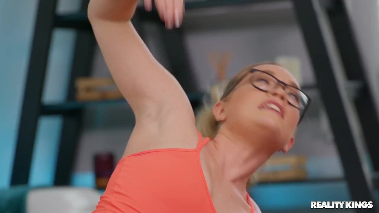 This video kills two birds with one stone. It’s going to give you something to cum to, that’s no question. But you’re also going to get an up-close and personal stretching class from the beautiful, blonde, bodacious Katie Kush! In skin hugging leggings and an even tighter top, she wiggles and stretches her admirably fit body. She’s in the middle of a gorgeous splits position when her boyfriend and his friend, Ricky Johnson, unexpectedly come home. Her boyfriend leaves this sexy pair alone while he makes some phone calls, so Katie continues stretching. But Ricky can’t keep his eyes off this babe. Katie asks Ricky to help her with some positions. But things don’t stay platonic for long, because soon enough she’s “stretching” out Ricky’s hard cock with her hand! They fuck in the living room with her boyfriend nearby, taking advantage of Katie’s flexibility for some super hot sex positions. Who knew stretching could be so sexy?