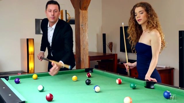Sabrina Spice is allegedly visiting Nick Ross for a game of pool, but with the tight teen dressed to the nines it's hard for Nick to keep his hands off her. He comes up behind her under the pretense of helping her line up her shot, but as he grinds his cock against Sabrina's ass the horny teen knows what Nick is really after. She turns in his arms to deliver a searing kiss that lets him know she's interested in taking things further.Slipping his hands around Sabrina's slim figure, Nick palms her ass as he lifts her miniskirt. He also pushes the top of her dress down so he can feel the heat of her little titties. Once she has been uncovered on the top and bottom, Sabrina sinks down to a crouch where she can easily pop Nick's hardon out to suck and stroke. Her BJ is as sweet and sexy as she is!When Nick helps Sabrina out of her dress and onto the pool table, he is greeted by the delight of her pierced clit. Sabrina's nicely trimmed muff tickles Nick's nose as he leans in to sample her wetness. He could keep on eating that snatch out all day, but the appeal of sinking balls deep into that dripping warmth is more than he can bear. Sliding all the way inside, Nick gives Sabrina all of the D.Rolling onto her stomach with one foot anchoring her on the ground, Sabrina thrusts her ass in the air as an invitation. Nick is happy to give her exactly what she wants, delivering a proper pussy pounding. Within moments, Sabrina is moaning her delight at the deep pleasure that Nick's cock is bringing her. While she has reached her peak on the pool table, there's still so much to explore as they relocate to the bedroom.Curling up on her back on the bed, Sabrina brings her knees up to her shoulders to open herself completely for Nick to dive deep inside once again. His thrusts are so deep that she can't hold her position for long. Eventually her legs come apart, leaving Sabrina holding her ankles as she watches Nick dominate her tiny teen body.Nick can dive deeper than ever when Sabrina gets onto her hands and knees for a doggy style pussy pounding. Anchoring his hands on that ass, Nick goes to work to satisfy both of their needs. He pulls her torso up until Sabrina's back hits Nick's chest, changing up the angle of penetration for an even more delicious sensation.Taking a turn on his back, Nick pulls Sabrina on top of him. She slides down easily onto Nick's thick stiffie, taking a moment to enjoy being fully impaled before she kicks off a lusty ride that leaves her moaning and boneless. Now that Sabrina has been thoroughly loved, the curly haired cutie gives as good as she got stroking Nick off until he gives her the cum shot she's been jonesing for.