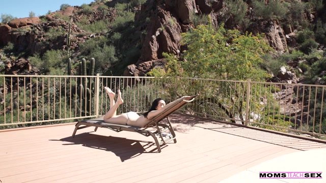 Silvia Saige is hanging out with her stepdaughter Aria Alexander. She has just stepped in to take a phone call when she sees her stepdaugher's friend Alex Jones spying on Aria! Chris is embarrassed when he's caught with his cock out, but Silvia takes pity on him and offers to help him get some.When Alex gets naked to put on some swim trunks, the girls confront him in the cabana and make it clear that he won't need any pants. Within moments Aria is eagerly giving Alex a blowjob with Silvia watching and helping as needed to make sure that it's the best Alex has ever had.Eventually it's time to kick things up a notch. Flipping over to lay on her belly with her head between Silivia's legs so that she can eat out her stepmom's juicy snatch, Aria thrusts her ass up in the air so that Alex can slide home into her tight twat. Alex takes Aria up on her invitation, pumping in and out of her fuck hole with the goal of making her cum!Although Aria is loving every second of her pussy pounding, Silvia deserves a turn, too. She decides to demonstrate the proper way to go for a stiffie ride while using Alex as her personal stud. Soon she is bouncing on Alex's cock so fast that her big tits bounce with the force of it, and she won't stop until she is pulsing with ecstasy.Now that Aria has seen her stepmom cumming, she wants another turn. Pushing one leg up high in the air for deeper penetration, Aria welcomes Alex back into her landing strip twat so that he can drive her towards paradise.Once he has achieved his goal, Alex gets a treat of his own when Aria and Silvia press their bottoms together over his cock and start bouncing away with their makeshift channel. It isn't long before Alex can't hold back anymore. The girls turn around just in time to each get a face full of hot cum that they share with a kiss.