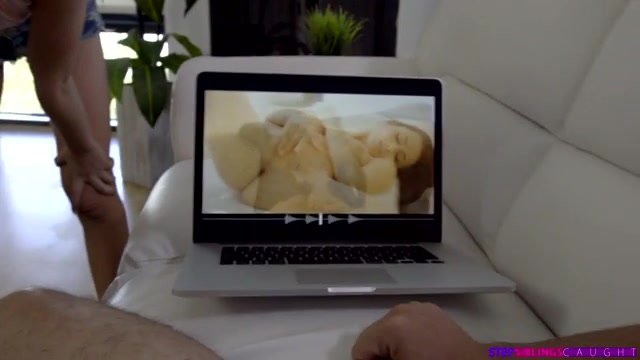 T Stone is in the middle of a marathon masturbation session with the inspiration of an online video that gives him a beat to jerk off to. When his stepsister Kenzie Reeves walks in on him masturbating, she challenges him to last two minutes while watching her boyfriend fuck her. T accepts Kenzie's challenge, then one ups her by saying he could last even if she was naked. Kenzie is game to keep escalating the bet with a sexy striptease.Once Kenzie's panties hit the ground, she caresses her small boobs and bald pussy. T still hasn't cum, so she drops to her knees to stroke him off. Leaning forward, she puts her mouth to work as well. Even that doesn't bring T off, so Kenzie lays on the couch and spreads her thighs so he can bury his fuck stick balls deep in her bare twat. Soon the pair is fucking at a hard fast pace that gets Kenzie moaning about her love for T's big cock.Getting on her hands and knees, Kenzie turns around so that T can bang her from behind. The porn keeps playing in the background, providing a sensual backdrop that helps T keep up the perfect rhythm. He brings Kenzie off, and then barely pulls out of her horny sheath before exploding all over her back. Kenzie considers herself the winner since T has not reached the end of the Cock Hero video.