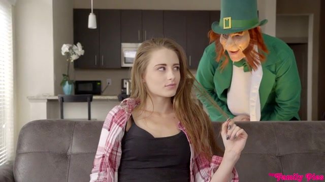 Kyler Quinn is hanging out on the couch when she hears a suspicious sound behind her. She turns around and spots a creepy leprechaun jerking his willy as he stares at her. Kyler runs to her parents, Sebastian Diox and Crimson Morningstar to try to tell them. They brush her off, telling her there's nothing out there and that she imagined it. Later, Kyler sees the leprechaun as she admires herself in the mirror after a shower. She freaks out again, but again her parents discount her claims.The next morning, Kyler wakes up to the leprechaun in bed with her, still beating his meat. She asks if the leprechaun will disappear if she lets him fuck her. He nods, so she pulls her sleep shorts aside and tells him to get it over with. They spoon like that for a while, then Kyler gets on her hands and knees so her leprechaun lover can pound her properly from behind.Rollin onto her back, Kyler moans as her leprechaun brings her off. He gluts her with a creampie of hot cum right after. Before Kyler can tell if he's going to keep his promise to disappear, her parents come in to talk about the leprechaun. When they realize the leprechaun is real and right in the room, they unmask him to reveal Justin Hunt, Kyler's stepbrother. Both parents freak out when they realize he came in his sister, who isn't on birth control.