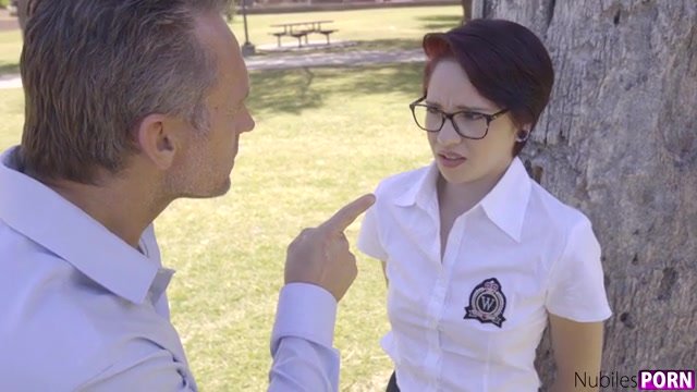 Cadey Mercury gets ready for school with makeup and her uniform, but as she's on her way out the door she runs into her stepdad Marcus London. He warns her that if he catches her fucking off instead of going to school one more time, he'll put a leash and collar on her and walk her home. Cadey doesn't heed Marcus's warning, and that same day she sits under a tree with her miniskirt hiked up and a cigarette in her mouth. When Marcus catches her, he makes good on his promise. When Cadey won't walk with the leash, he makes her crawl.When they finally get home, Marcus puts Cadey over his knee and spanks her until she reveals that she's misbehaving for a boy. When Marcus realizes that his rough treatment is turning Cadey on, though, she manages to turn the tables on him. Pulling out his hard dick, Cadey opens her mouth for a deep throat BJ while Marcus controls her with the leash. Once she's naked, he leads her to the couch and feasts on her landing strip fuck hole before taking her. On her hands and knees, Cadey moans her excitement as Marcus takes her from behind while slapping her perky titties. Then he switches positions so that she is sitting on his lap as he pistons into her greedy twat and holds her there until she starts moving with his strokes. Flipping her onto her back, Marcus slams balls deep into Cadey's creamy snatch until she's screaming her passion. Moments before he cums, he pulls out to cover Cadey's mound in jizz. Only then does Cadey promise to be good.