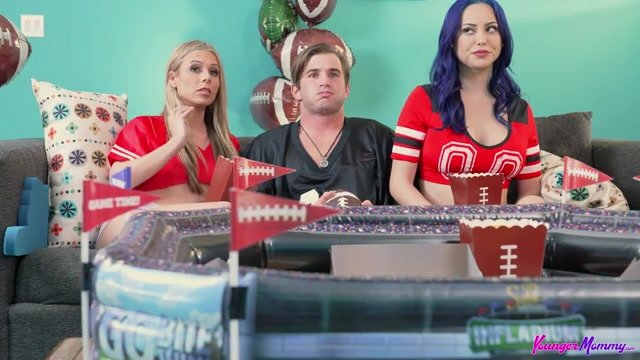 Summer Vixen and her stepson Nathan Bronson are watching the biggest game of the year together, joined by Summer's friend Eve Marlowe. Nathan is really into the game, but Summer and Eve are getting bored. Eve is also pretty ticked that Nathan keeps hitting on her and blatantly checking her out. The girls supply some snacks in a really cute blowup stadium, but once that puttering is done they don't know what to do with themselves. Eventually Summer gets the bright idea to steal her stepson's toy football and play a game of keep away with Eve while Nathan tries to get it back. Nathan gets increasingly upset, so once he gets his football back he spills a drink and uses that distraction to stick his dick into the snack stadium.While Summer is just ticked off, Eve is ready to get even with Nathan for his gross prank. She tells Summer that she's going to see if her little pervert stepson can keep that wood going when shit gets real. She tugs Nathan's boner out and then leans in to suck it while Summer watches. Not only does Nathan keep his wood, he also impresses with the size of that thing. Eve doesn't want to stop sucking! Summer can't deny how hot it is to see how well hung her stepson is, and while she can't bring herself to break her marriage vows to Nathan's dad, she can certainly watch her BFF bang Nathan and give them both increasingly sexual instructions. Even is certainly game for a little exhibitionism when it involves getting that hardon all to herself.Finally rearing back from her enthusiastic BJ, Eve pops those generous boobs out to give Nathan a tittie fuck. Then she strips out of her football gear and gets down on the couch so that Nathan can eat her pussy. Since he's been crushing on Eve, Nathan is over the moon to comply with Eve's instructions. As his tongue makes magic between Eve's thighs, Summer strips down and commands Nathan to look at her while she masturbates and to dream about banging his hot stepmama. He gets to enjoy a real puss as Eve straddles his dick and rides him in reverse cowgirl with Summer lapping at her BFF's tits. Falling to their sides, they engage in some spooning sex. Eve's landing strip snatch welcomes Nathan back inside one last time as he stands between her thighs and pounds away at her greedy twat. Pulling out, Nathan covers Eve's stomach in cum as Summer eggs them both on.
