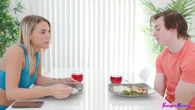 Evelyn Payne knows her husband is cheating on her. She has prepared a nice meal with his favorite wine and waited until late to see if he showed up. After telling her husband off on the phone, she goes to complain to her stepson, Anthony Pierce. She eventually asks Anthony if he’ll just join her for the meal so it doesn’t go to waste. As they eat, Evelyn keeps on complaining about how much her husband neglects her.Eventually the conversation turns to Antony’s sex life. Evelyn offers to help satisfy her stepson since she knows his dad is off fucking around on her. Anthony is hesitant at first, but his stepmom is a lot closer to his age than his dad’s. He lets himself get talked into enjoying Evelyn’s charms. Relocating to the bedroom, Evelyn lays Anthony down and uses her body to wind him up. Then she sucks his big chub while complimenting how nice and hard he is.Climbing aboard that man meat, she seats herself in reverse cowgirl and goes to work riding as Anthony squeezes her ass. Then she turns around so Anthony can enjoy watching her face to face as she keeps their party going. On her knees, Evelyn moans and rocks back to meet every stroke as Anthony gives it to her in doggy. Evelyn winds up on her back with Anthony giving it to her, first in missionary and then spooning behind her. He waits for permission and then blows his load into a facial that leaves Evelyn smiling as cum drips down her face.