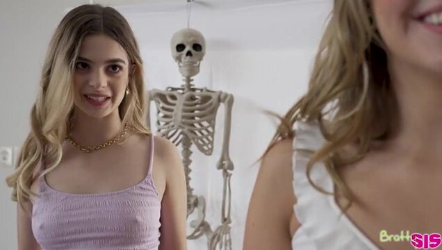 Molly Little and Mia Kay are having a blast decorating for Halloween. When Nathan Bronson, Molly's stepbrother, comes in and compliments them, the girls are all smiles. Molly even gets up nice and close to a skeleton and pretends to fuck it and suck it while Mia urges her on. Grabbing a cob of corn, Mia puts it up next to Nathan's crotch and pantomimes a handie. Molly is curious whether Nathan's dick is really that big, and he invites her to find out. Molly can't; Nathan is her stepbrother. The girls jet to change into their costumes.Molly is the first to return to the living room, where she finds that the skeleton has grown a nice cock. She gets on her knees to start sucking it, thinking it's Mia's boyfriend. Mia reveals that her boyfriend is out of town, but she agrees that it's a great dick so she goes for it with Molly to do a double blowjob with some ball sucking. Molly knows who it is, so she takes the skeleton away. That lets her peel her shorts down and mount the cock to twerk against it for real. Mia wants in on the action, so she takes it from behind as well while Molly watches and masturbates.The girls say Nathan's name to let him know that they know. Walking over to the couch, the girls sit side by side with their legs spread. Nathan takes it upon himself to drop to his knees and give a good pussy licking first to Mia and then to Molly. Then he lays down so Molly can ride him in reverse cowgirl while Mia rides his tongue. Getting Mia on her knees, Nathan fucks her in doggy while Mia feasts on Molly's puss. Molly winds up on her back with Nathan pistoning between her thighs and Mia riding her mouth. When Nathan is ready to pop, he pulls out to nut all over Molly and Mia's faces. The girls exchange cummy kisses, enjoying the sensation of being well fucked.