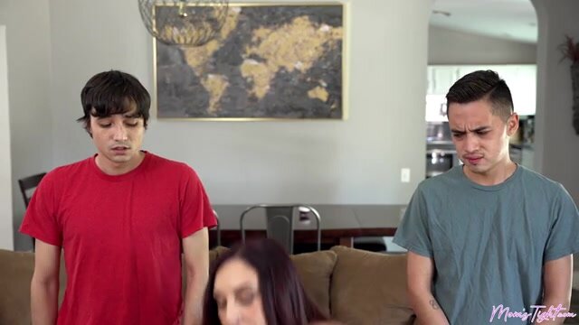 Ricky Spanish and Juan Loco are playing video games when Ricky's stepmom, Artemisia Love tries to tell them to get off the couch. She tells them they need to work out or they'll never be able to please their future wives. When the boys ignore her, she flounces off into her bedroom to change into some appropriate workout clothes that highlight her curves and give her some serious camel toe. Grabbing a whistle, Artemisia blows it to get the boys' attention and orders them off the couch.In their surprise, Ricky and Juan do as they are told. She begins by demonstrating some stretches to do before exercising, which just shows off her body even better. When Artemisia realizes that both boys have boners, she suggests that both boys fuck her since working out makes her hot as hell and she wants to show off how tight her pussy is. She gets down on her knees between the boys so she can demonstrate that she knows just how to handle two dicks at once by blowing and stroking.Getting on her knees, Artemisia gives her full attention to Juan in a deep throat BJ as Ricky eats her out and then fucks her in doggy. Juan gets to experience the tightness of Artemisia's velvet glove when she rides his hardon while blowing Ricky. Ricky gets to enjoy Artemisia on her back as he gives it to his bigtit milfy stepmom whose mouth is busy on Juan's cock. Juan is the first to cum, blowing his load on those lovely boobies. A moment later, Ricky pulls out for his own cum shot across Artemisia's belly. She tells the boys if they quit with the video games maybe they can all do this again.