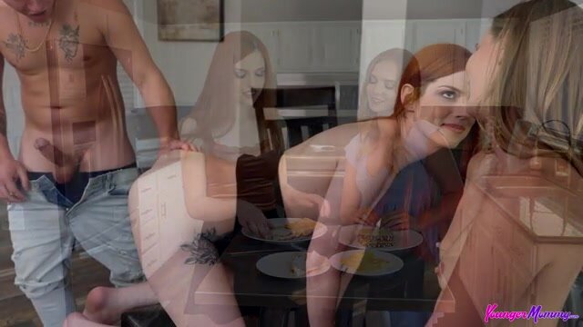 Scarlett Mae and Stella Sedona are making lunch in the kitchen when Scarlett Mae's stepson, Joshua Lewis, wanders in without a shirt. The girls talk about how they wish they could do that since it's so hot outside. Joshua asks why they don't just go topless. The girls think about it, then decide to try it out while they eat lunch. Taking off their tops and bras, they prepare to eat their sandwiches when Joshua comes back into the room. He stops midsentence and pops an instant boner when he sees the boobies just chilling. The girls call him out on it, saying he told them that he could handle it. When Joshua claims he's not hard, Scarlett Mae tells him to take his pants off, proving his lie.Once they see what a nice dick Joshua has, it doesn't take long for the ladies to decide they'd like to sample it. Scarlett Mae lets Joshua do her in doggy while Stella Sedona wavers about it. When Stella Sedona decides she wants some, Joshua is happy to fuck her as she lays on the bench. Stella Sedona turns to masturbating as Scarlett Mae rides Joshua in reverse cowgirl, then hops onto the cock in cowgirl. Sated, the ladies get on their knees and deliver a ball sucking double blowjob until Joshua pops all over their faces, giving them a treat to play with before lunch.