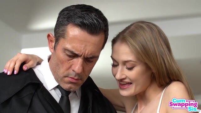 Ivi Rein and Tiffany Tatum are having some girl gossip in the kitchen. They both agree they're into older guys. Ivi uses Tiffany's judge stepfather, Renato, as an example of a guy she's into. When Renato walks in on them, they make him uncomfortable by continuing to talk dirty until he leaves. Later, dressed in short skirts and hot thongs, the girls wait for Renato to come home. When he does, they pounce on him. Ivi climbs beneath Renato's coat while Tiffany drops kisses on his face. Renato puts up some token resistance, but with Ivi sucking his dick and Tiffany kissing and pawing at him, he quickly relents. Renato's reward is two girls blowing him together while taking turns sucking his balls.When Ivi and Tiffany get on their knees on the couch and flip up those miniskirts, Renato knows just what to do. He dips into Tiffany's velvet glove first as Ivi caresses and kisses her friend. Then Renato gives Ivi the same treatment. The girls suck their own goo from the D and then Tiffany climbs aboard to ride in reverse cowgirl. Ivi gets to take it on in cowgirl while Renato sucks Tiffany's toes and Ivi eats her BFF out. Tiffany enjoys one final dicking down as she lays on her side and laps up Ivi's juices. They finish their threesome with Ivi on her back and Tiffany riding Ivi's face. The position lets Tiffany lean forward to take a mouthful of cum so she can swap it with Ivi and play with their salty treat.