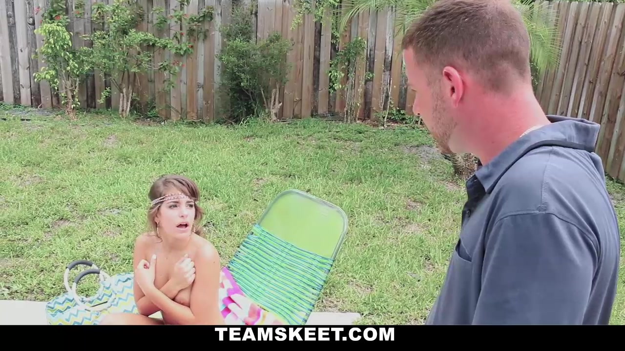 Kimmy Granger is a bad girl. She sneaks into her neighbors backyard to use his pool and to tan in his backyard while hes at work, but today it didnt go as planned. The neighbor forgot his wallet so he came back home to get it when he saw perfect Kimmy laying nude in his backyard! He went outback and was pissed that she was trespassing and she couldnt stop apologizing - she offered to do whatever it takes for him to not call the cops or tell her parents! Kimmy showed him her perky tits and her perfect pink pussy and that was enough to persuade him. He took out his big stick and she showed him how good she is at giving head! They took it inside where he drilled her tight teeny pussy making her moan and cum! He bent Kimmy over destroyed her 18 year old twat, making her cum on his huge rod one last time before he shot his load all over her beautiful face! Tell us what you think of Kimmy in the comments below.
